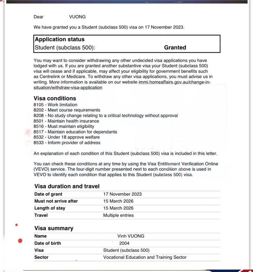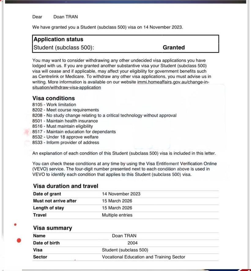 Để được cấp visa cho công dân Việt Nam, bạn cần tuân theo quy trình và yêu cầu của quốc gia mà bạn muốn đến. Mỗi quốc gia có quy định riêng về việc cấp visa và các yêu cầu có thể khác nhau tùy thuộc vào mục đích và thời gian lưu trú. Dưới đây là mẫu Visa 500 Úc cấp cho công dân Việt Nam.